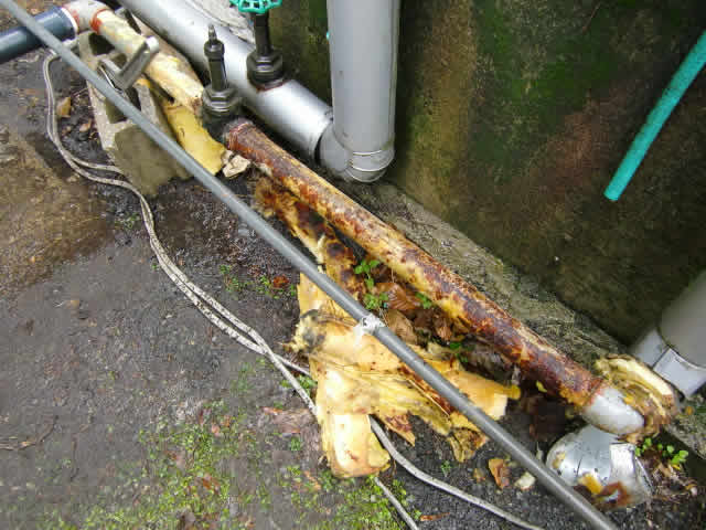 こんな所に落とし穴配管の保温カバーを外すと配管腐食による漏水