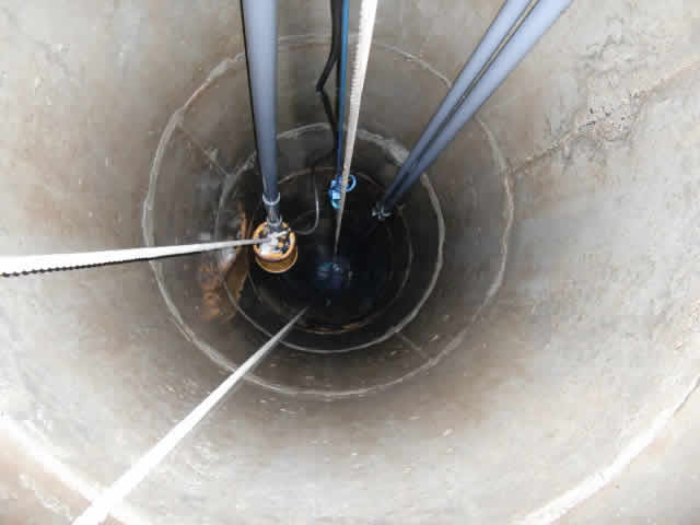 排水ポンプで水替えです。深度が深いので水中ポンプを直列に連結して揚水します。