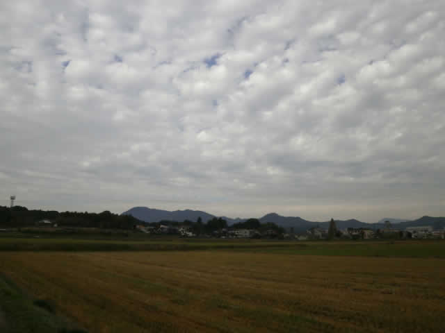 わーい(嬉しい顔)稲刈りの済んだ田んぼと秋の空が平和でのどかな町を象徴しています黒ハート